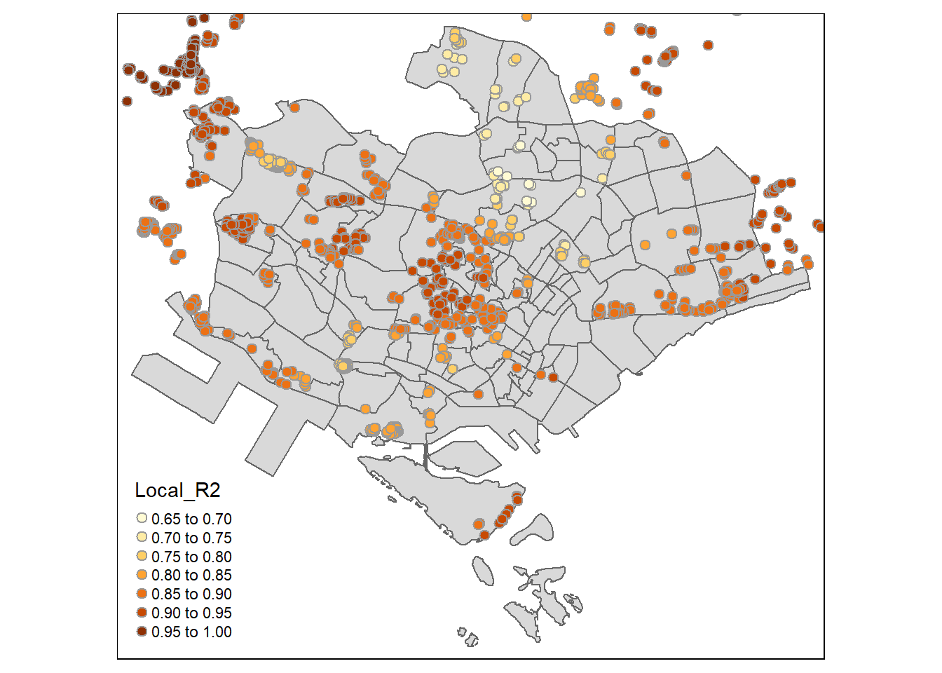 The report shows that the adjusted r-square of the gwr is 0.8561 which is significantly better than the globel multiple linear regression model of 0.6472.