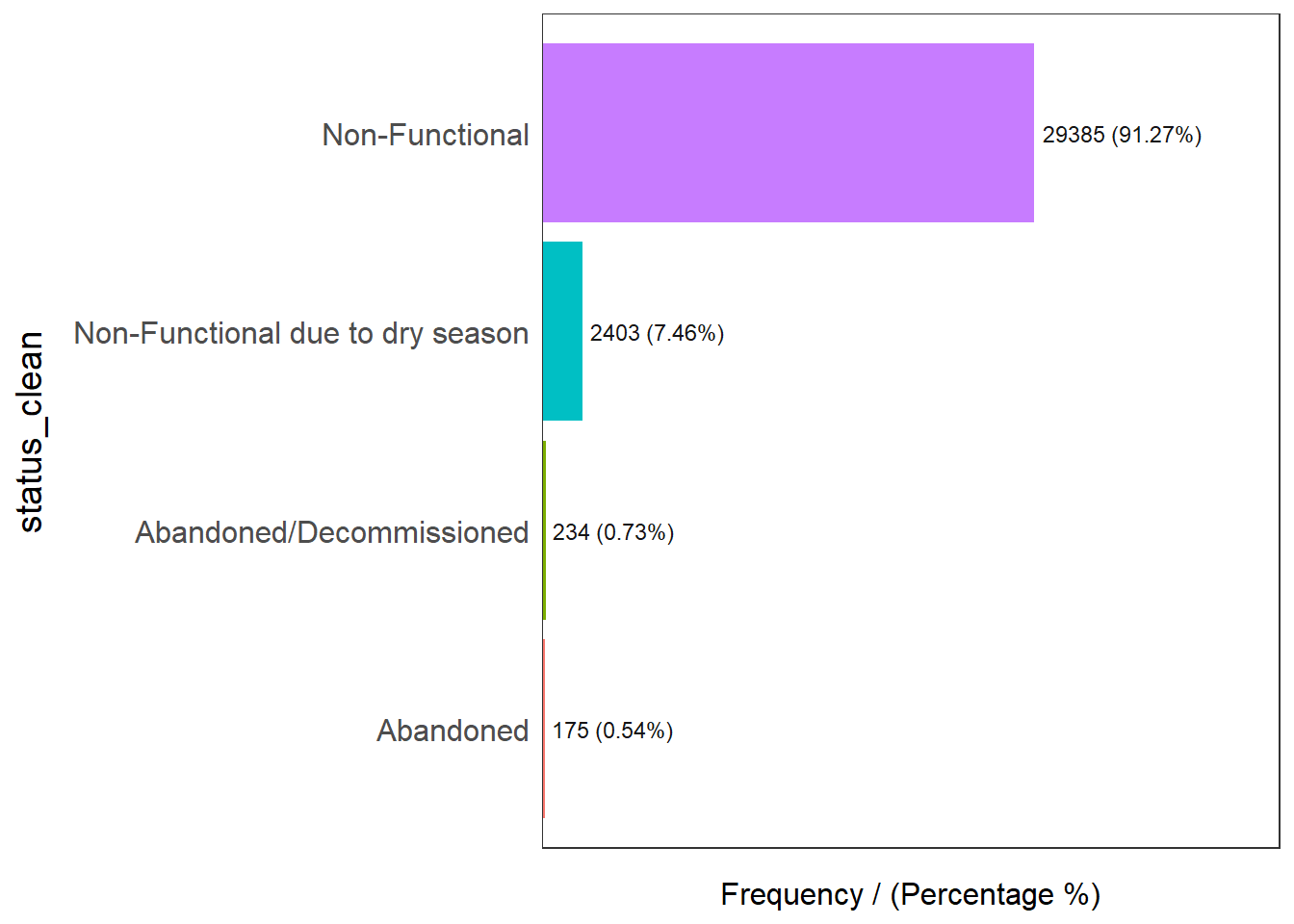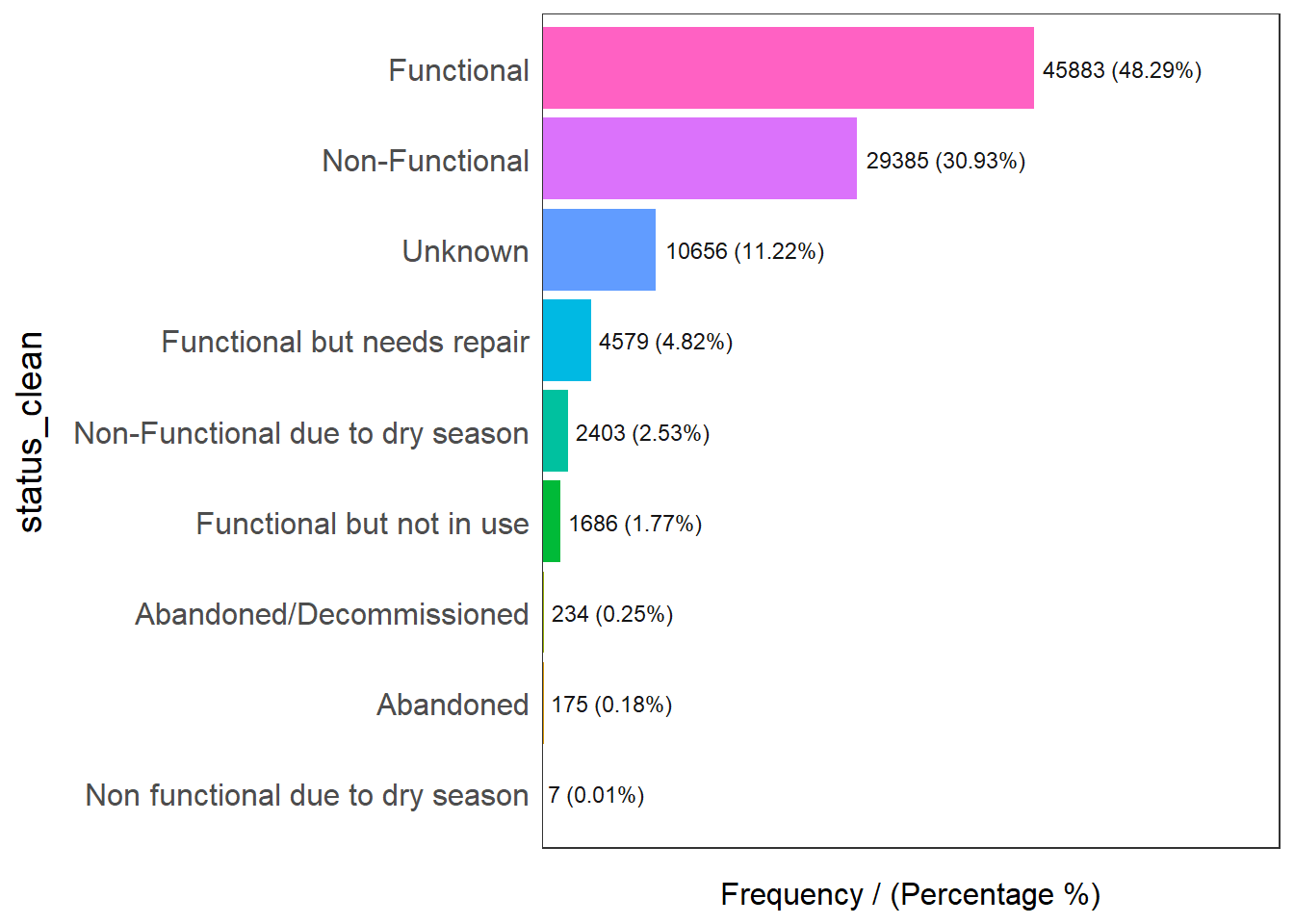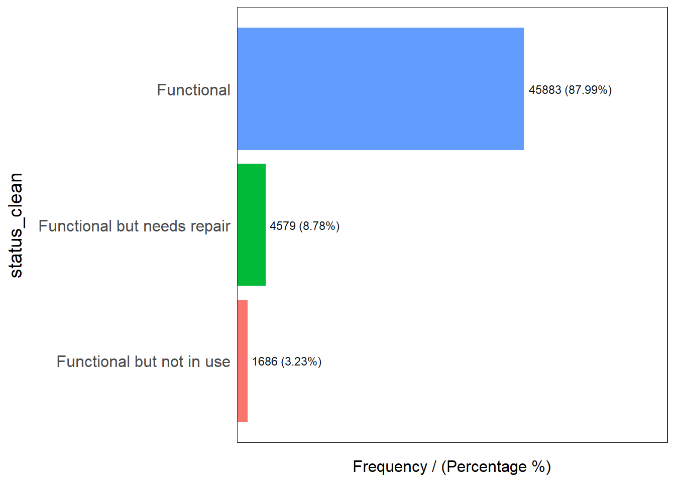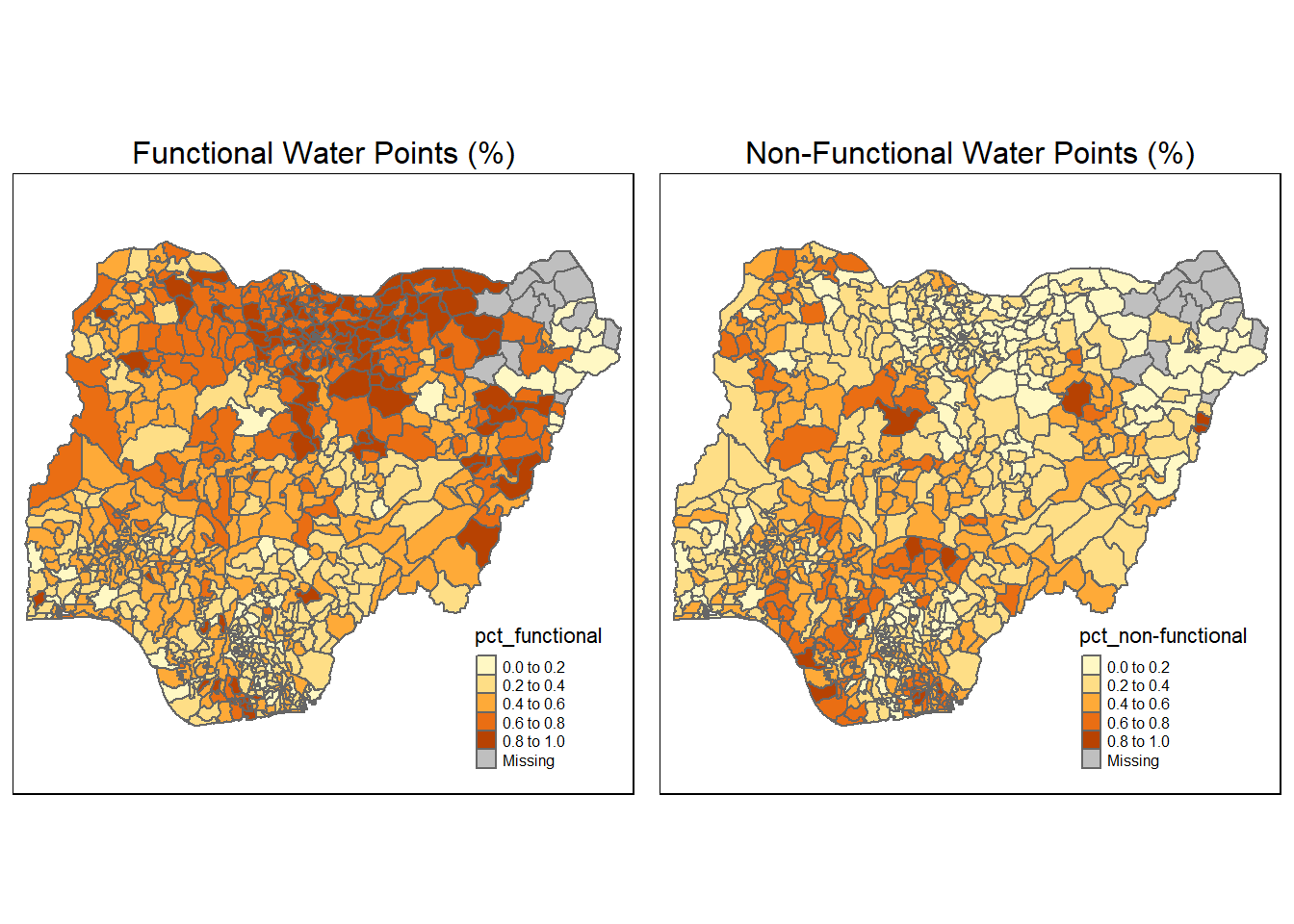 Dplyr’s function filter() is used to classify functional water points and proportion is plotted after filtering.