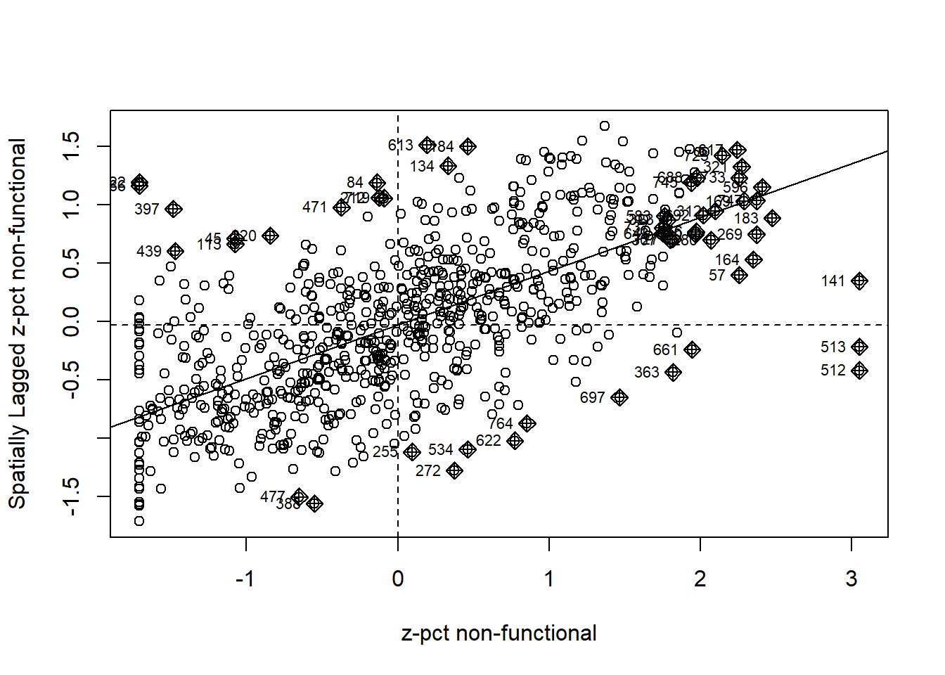 As expected, high non-functional water points % areas also correspond to positive GI statistics that show presence of hot spots (high value clusters). Hot spots occur when the average of a polygon’s neighbors is higher than the grand average.
