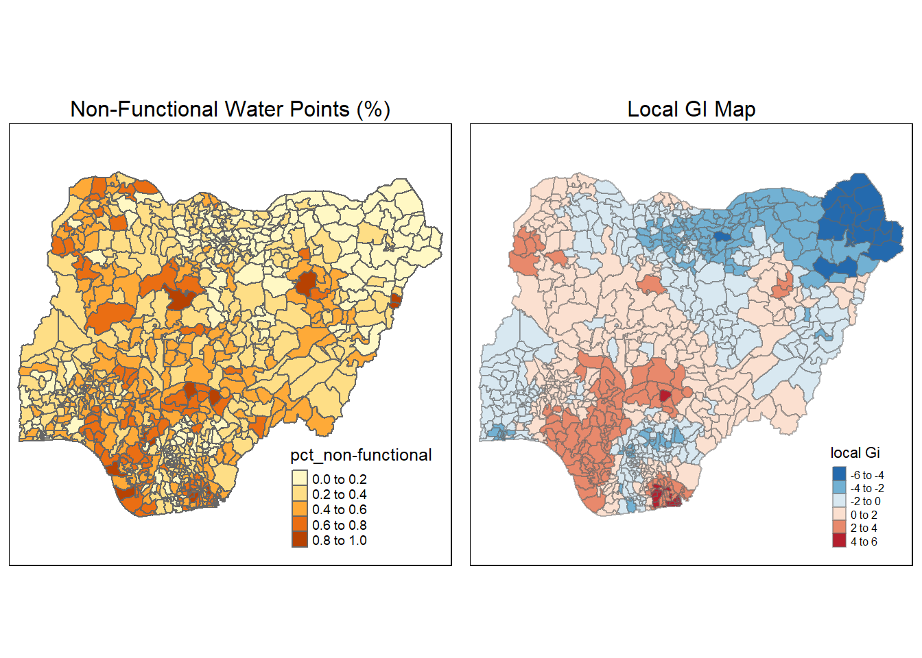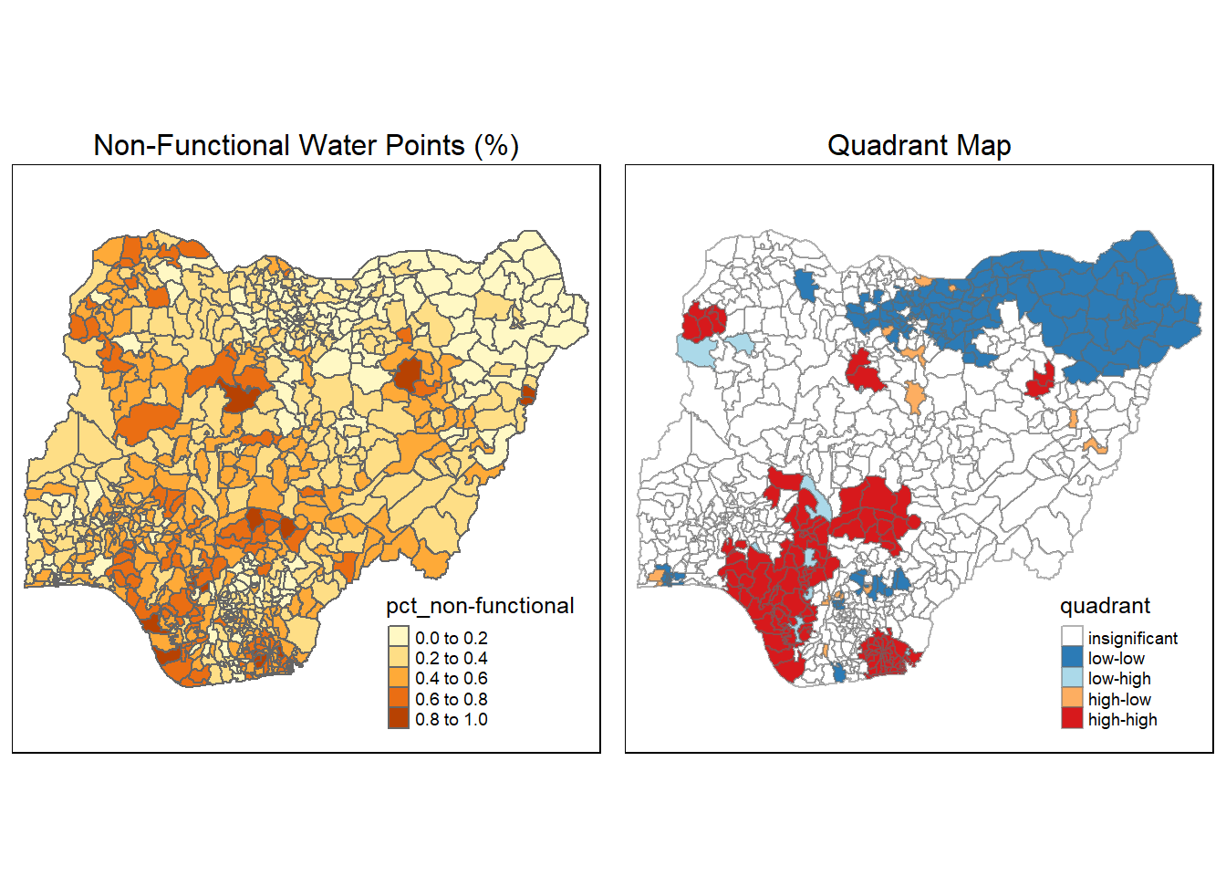 Geospatial analytics hold tremendous potential to address complex problems facing society. In this study, we will apply appropriate global and local measures of spatial Association techniques to reveals the spatial patterns of non-functional water points. Nigeria will be the country of study for this assignment.